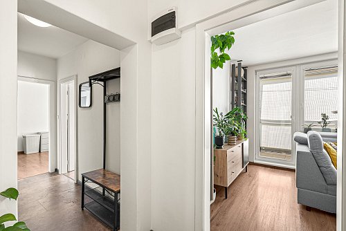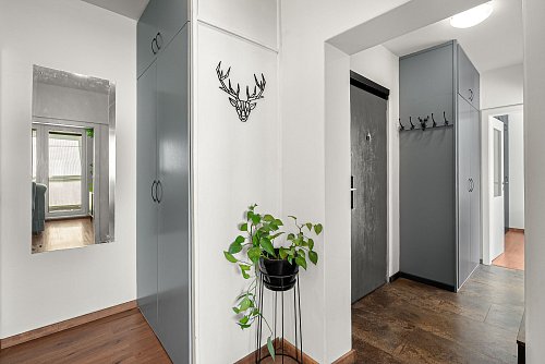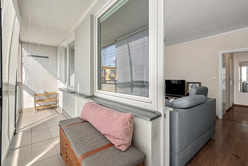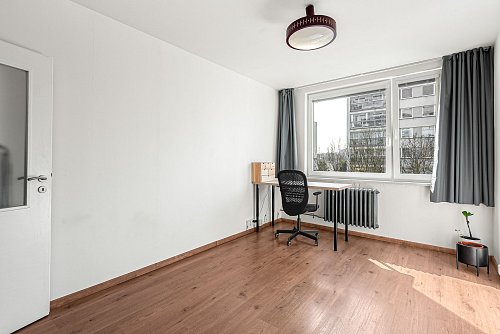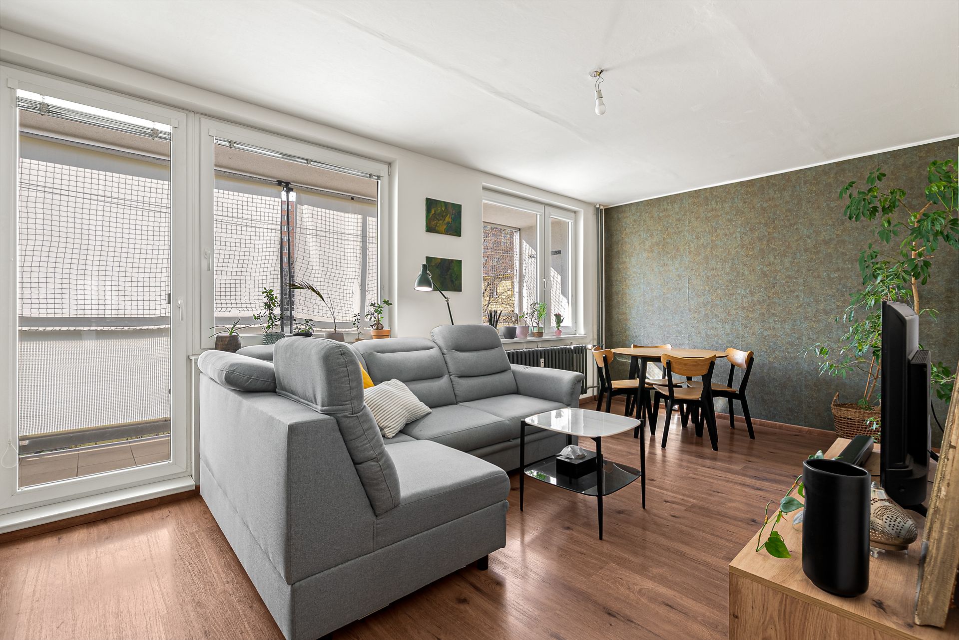 Srdcem bytu je prostorný obývací pokoj, který přímo vybízí k relaxaci a společným chvílím s blízkými. Odtud se plynule dostanete do kuchyně, která je řešena na míru s důrazem na každý detail, a také na útulný balkon. Ten je jako stvořený pro ranní kávu s výhledem do zeleně nebo pro chvíle klidného odpočinku po náročném dni. Dva další neprůchozí pokoje poskytují dostatek soukromí a flexibility pro každého člena rodiny, ať už jako ložnice, dětské pokoje nebo pracovny.